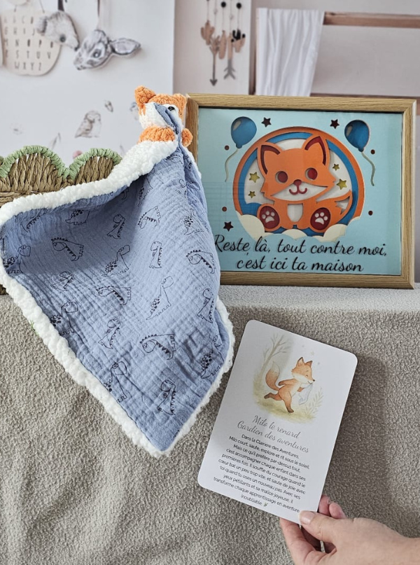Chaque coffret naissance personnalisé réunit un doudou fait main, un cadre lumineux assorti et des histoires douces à écouter, pour accompagner bébé jour après jour.